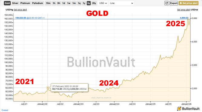 Finally, one good way to evaluate the state of the economy (if like me you're not an economist) is to track the value of precious metals like gold, silver, platinum and palladium, for as these rapidly increase in value, so fiat or paper currency dwindles proportionately. If you look at the chart you will see that the start of the collapse really started getting underway around the beginning of 2024 when gold was priced at about $2,000 per ounce. In the space of two short years, proceeding to the end of 2025, the price has shot up to about $5,000 per ounce, more than double the January 2024 amount, and it's still rising. Once gold and silver triple in value, the bottom will quite literally fall out of the market which may well collapse by as much as 95 per cent, many say. It's not a smooth curve, as you can see, but the trend is unmistakable.